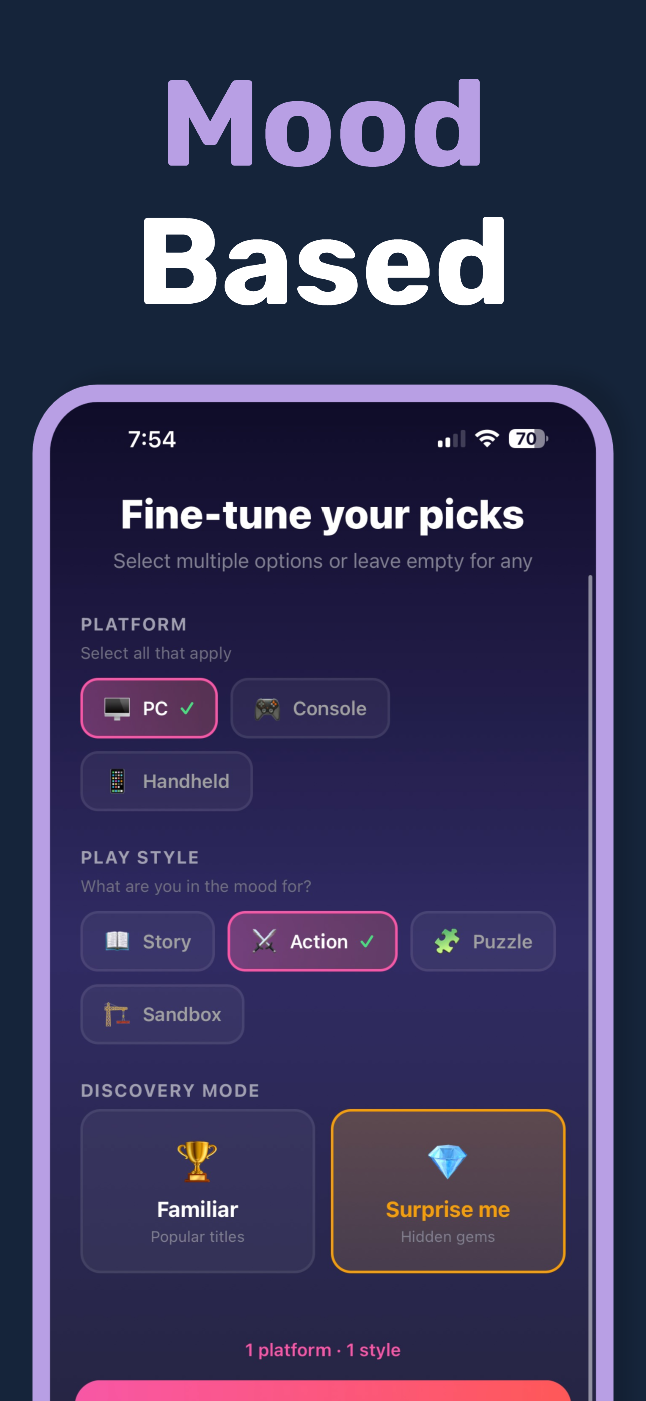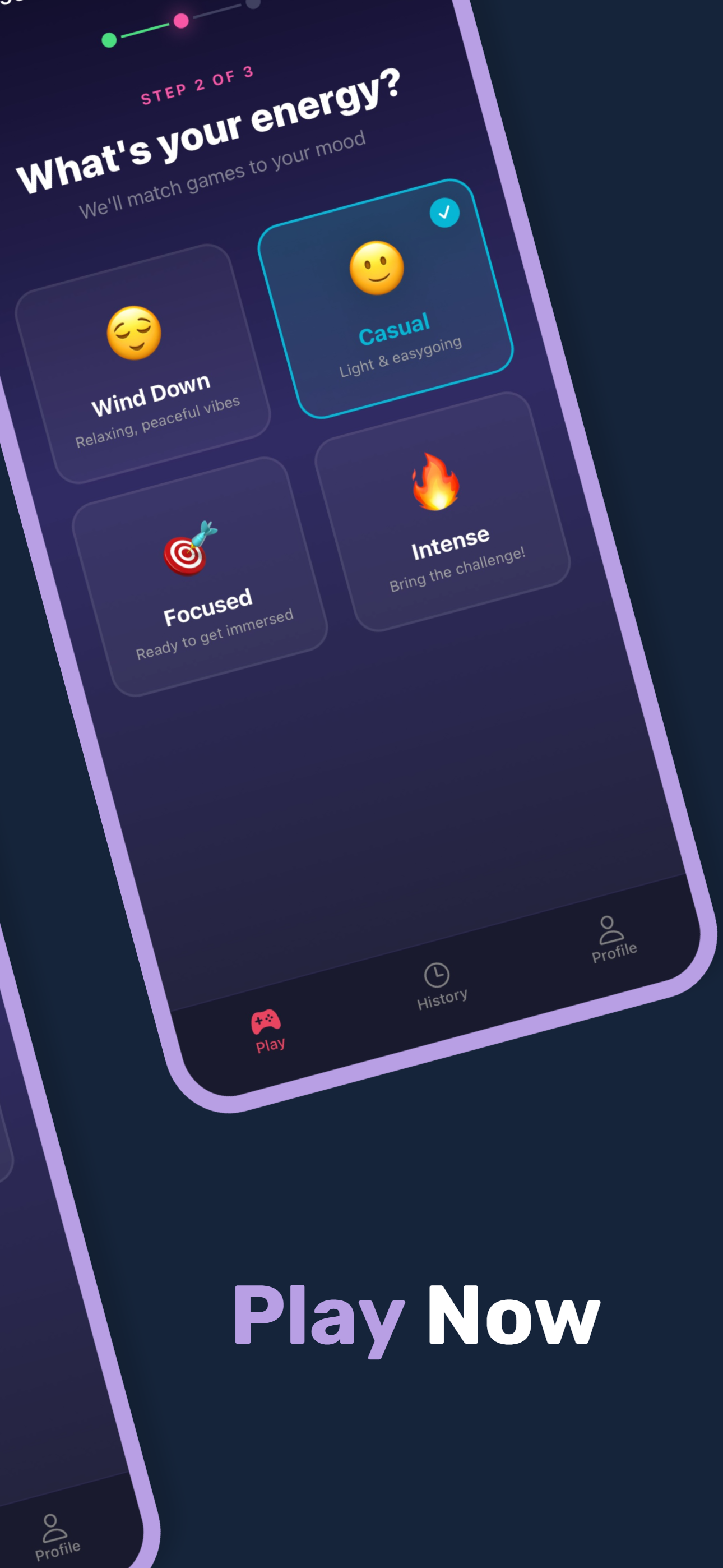 • Matches games to your current energy — wind down, casual, focused, or intense