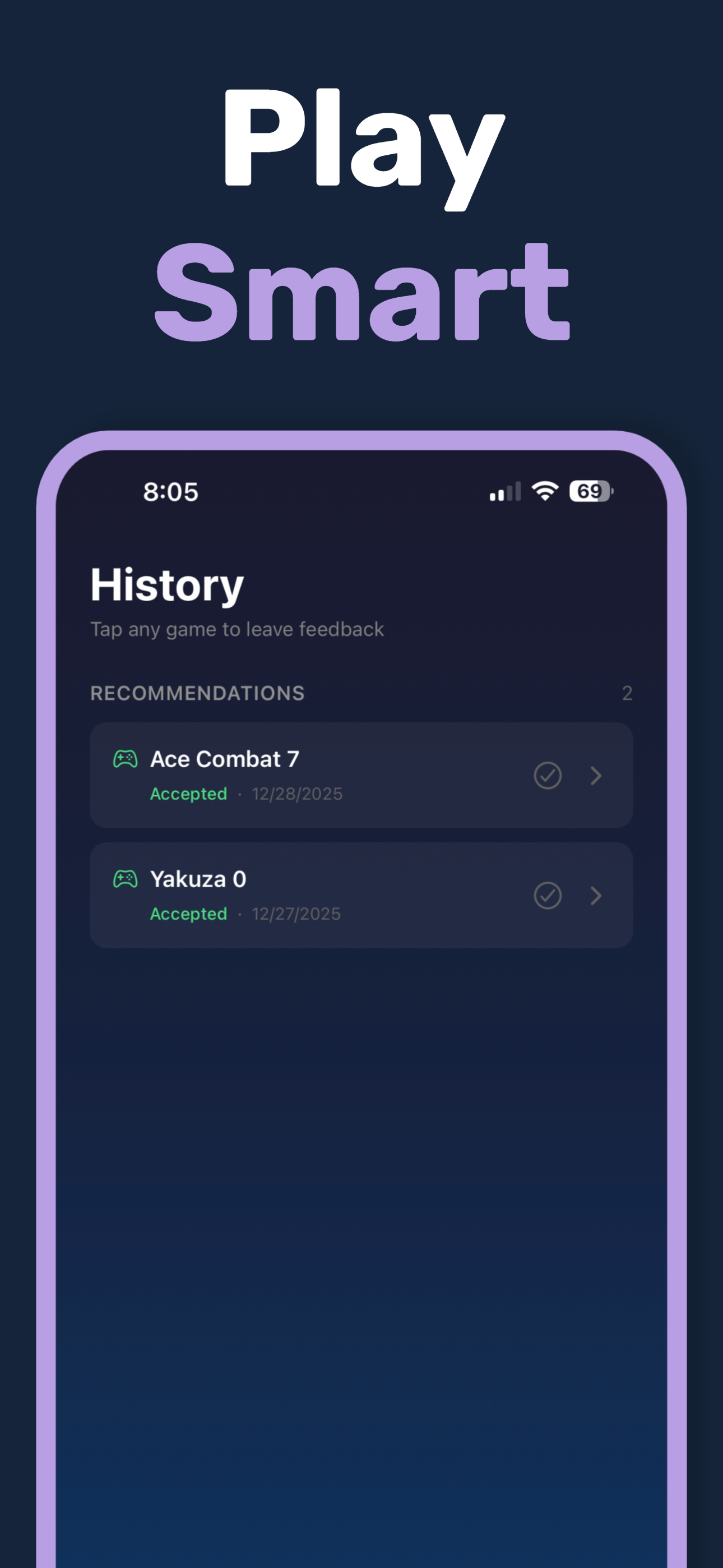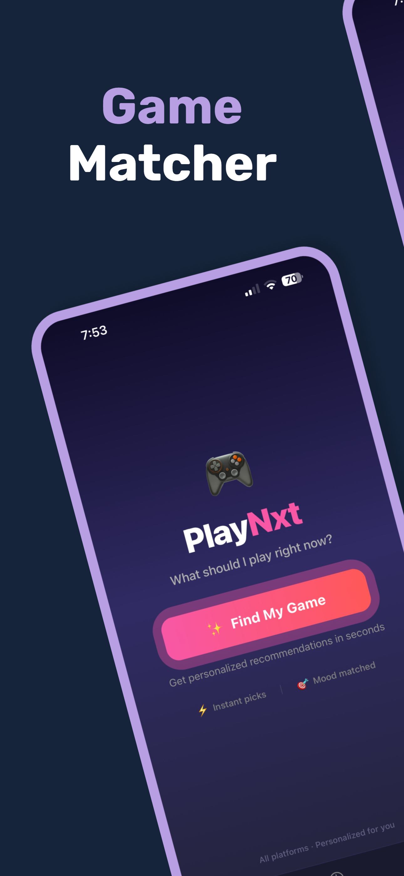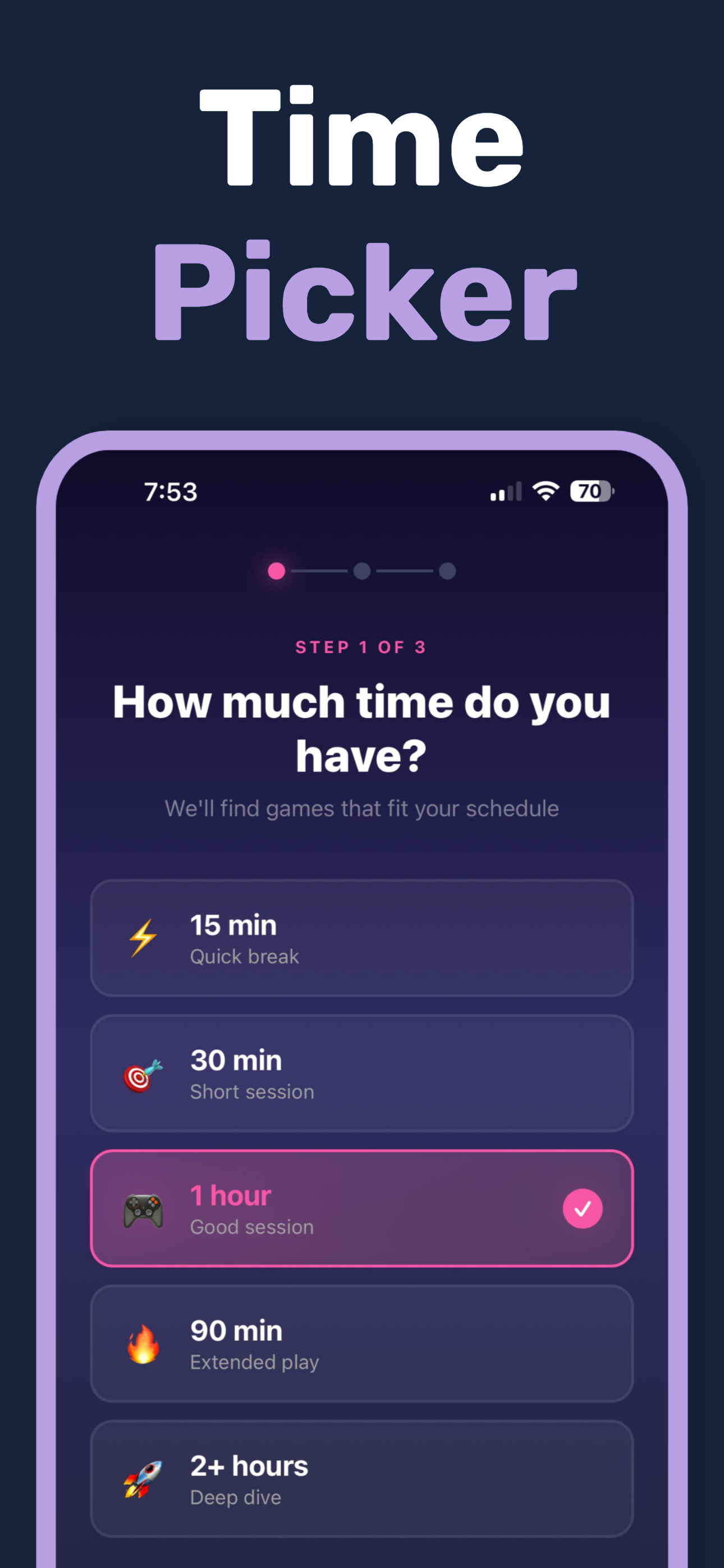 PlayNxt helps you decide what to play next by matching games to your available time, energy level, and play style.